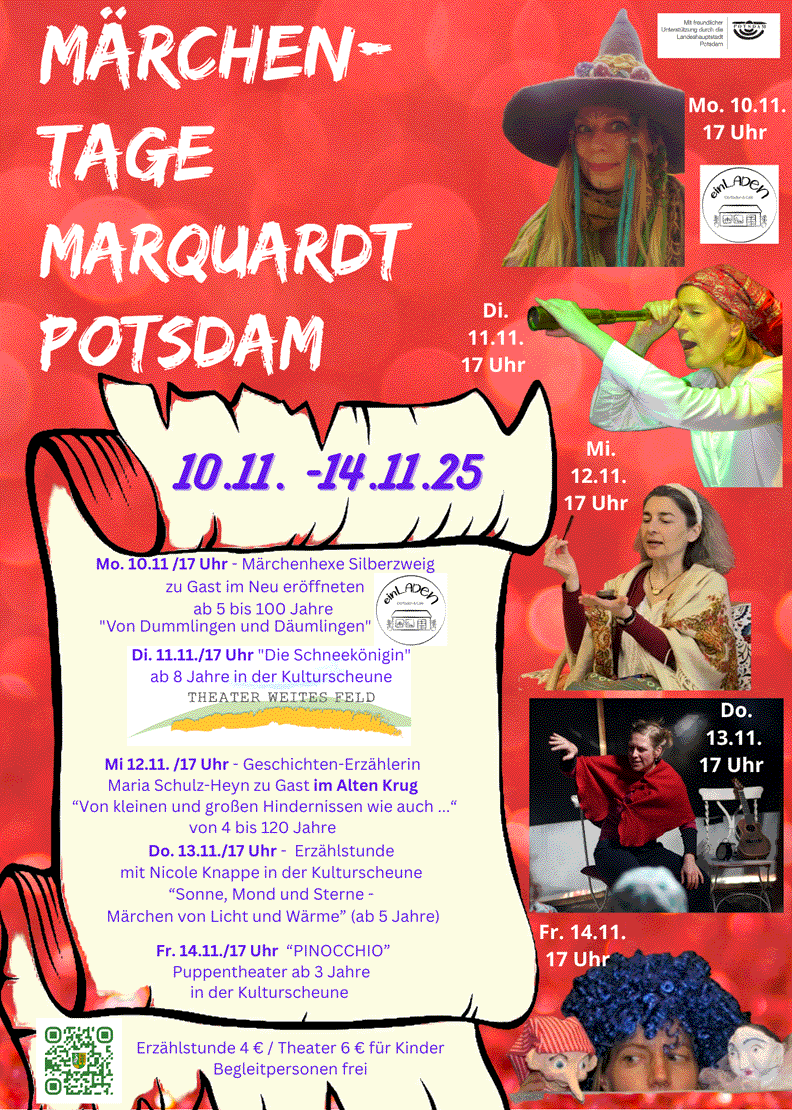 ![]() Märchentage Marquardt Märchenhexe Silberzweig hext Märchen von "Dummlingen und Däumlingen" Dorfladen & Café einLaden Hauptstr. 4 14476 Potsdam-Marquardt www.kulturscheune-marquardt.de Eintritt: Kinder 4, Begleitpersonen frei; Anmeldung nicht erforderlich |