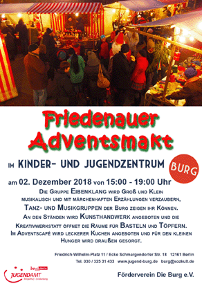 "Gritzko und der Pan" Geschichten von Narren & Schelmen Bürgertreffpunkt Bahnhof Lichterfelde West (im Bahnhofsgebäude S-Bahnstation Lichterfelde West) Hans-Sachs-Str. 4D, 12205 Berlin, Anmeldung/Information über: Tel. (030) 84 31 31 14 oder bahnhof-lichterfelde-west@ba-sz.berlin.de Eintritt: 7 Euro inkl. Kaffee und Kuchen Eine Anmeldung ist erforderlich. Eine Veranstaltung des Fördervereins Bürgertreffpunkt Bahnhof Lichterfelde West e.V. |