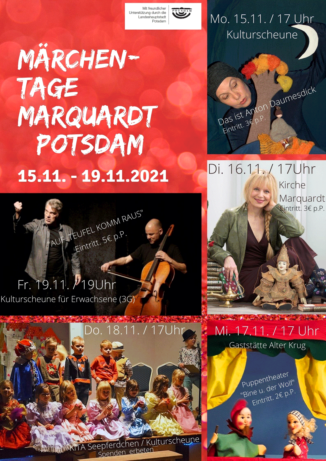 Märchentage Marquardt Märchenhexe Silberzweig hext Märchen von "Dummlingen und Däumlingen" Dorfladen & Café einLaden Hauptstr. 4 14476 Potsdam-Marquardt www.kulturscheune-marquardt.de Eintritt: Kinder 4, Begleitpersonen frei; Anmeldung nicht erforderlich |